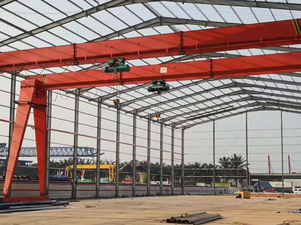 電動葫蘆門式起重機(jī)是有軌運(yùn)行的中小型起重設(shè)備,主要由門架(主梁、支腿、下橫梁等)、起升機(jī)構(gòu)、運(yùn)行機(jī)構(gòu)及電控部分組成,以電動葫蘆作為起升機(jī)構(gòu),工作時沿主梁工字鋼下翼緣運(yùn)行。門架結(jié)構(gòu)分箱形和桁架兩種,箱形工藝好,制作方便;桁架自重輕,抗風(fēng)能力強(qiáng)。整機(jī)具有自重輕、結(jié)構(gòu)簡單、安裝維修方便等特點(diǎn),適用于中小起重量范圍內(nèi)的廠礦、貨場及倉庫等室外場所作一般裝卸吊運(yùn)工作。