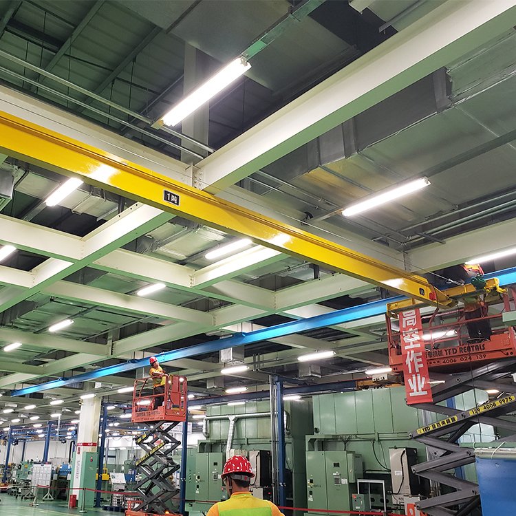 電動單梁懸掛起重機(jī)由鋼板與工字鋼組焊成的主梁、端梁、電動葫蘆及電動跑車組成,懸掛在廠房上部的工字梁軌道上,懸臂長度0.5~1m,電動葫蘆沿主梁工字鋼下翼緣運(yùn)行,完成物品的吊運(yùn)工作,具有結(jié)構(gòu)輕巧、安裝維護(hù)方便等特點(diǎn),廣泛應(yīng)用于生產(chǎn)車間、倉庫及貨場等場所。工作級別為A3-A5。
