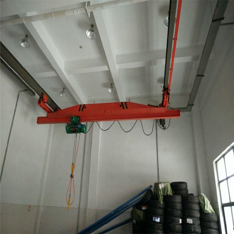 電動單梁懸掛起重機(jī)由鋼板與工字鋼組焊成的主梁、端梁、電動葫蘆及電動跑車組成,懸掛在廠房上部的工字梁軌道上,懸臂長度0.5~1m,電動葫蘆沿主梁工字鋼下翼緣運(yùn)行,完成物品的吊運(yùn)工作,具有結(jié)構(gòu)輕巧、安裝維護(hù)方便等特點(diǎn),廣泛應(yīng)用于生產(chǎn)車間、倉庫及貨場等場所。工作級別為A3-A5。