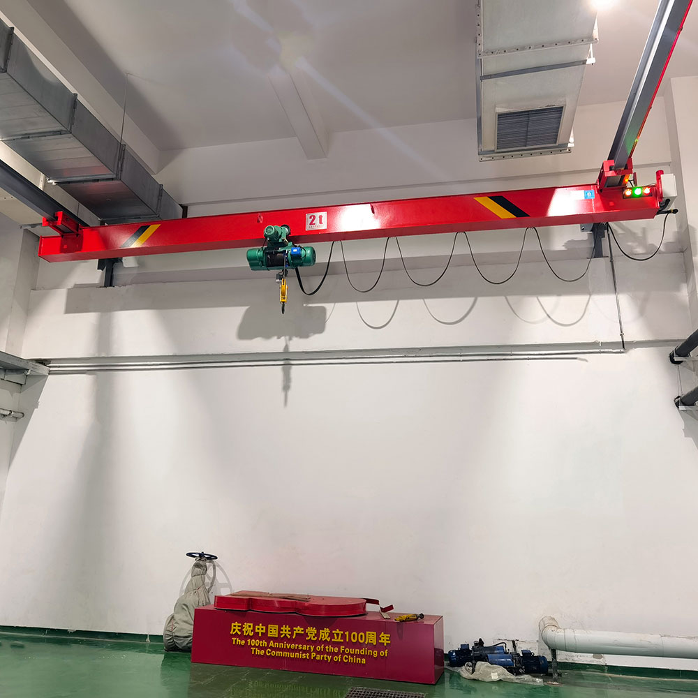 電動單梁懸掛起重機(jī)由鋼板與工字鋼組焊成的主梁、端梁、電動葫蘆及電動跑車組成,懸掛在廠房上部的工字梁軌道上,懸臂長度0.5~1m,電動葫蘆沿主梁工字鋼下翼緣運(yùn)行,完成物品的吊運(yùn)工作,具有結(jié)構(gòu)輕巧、安裝維護(hù)方便等特點(diǎn),廣泛應(yīng)用于生產(chǎn)車間、倉庫及貨場等場所。工作級別為A3-A5。